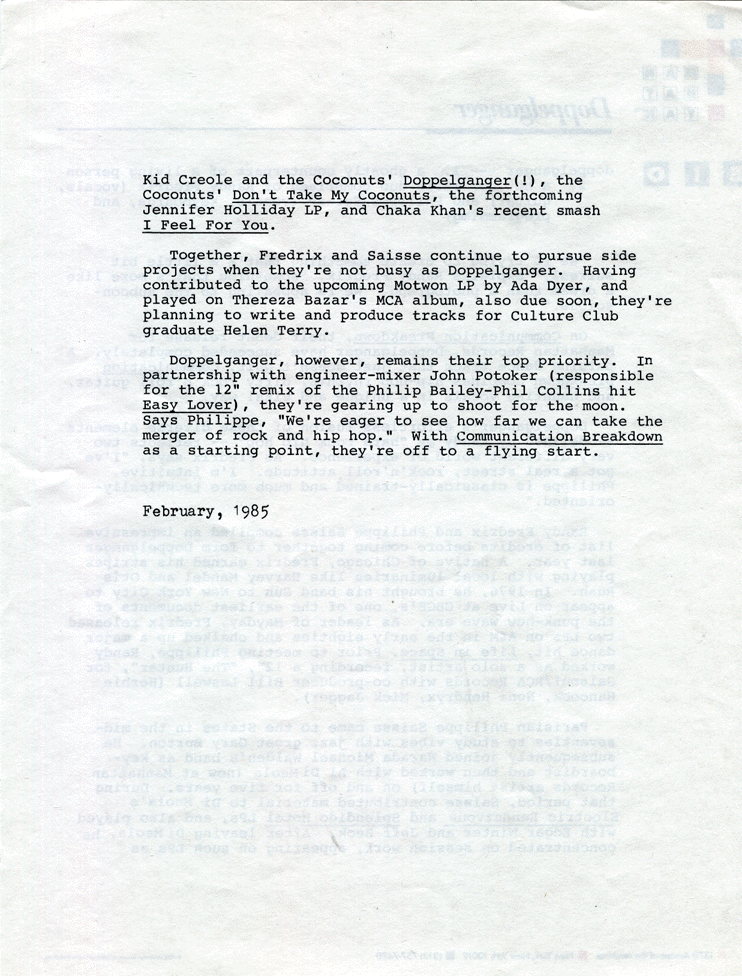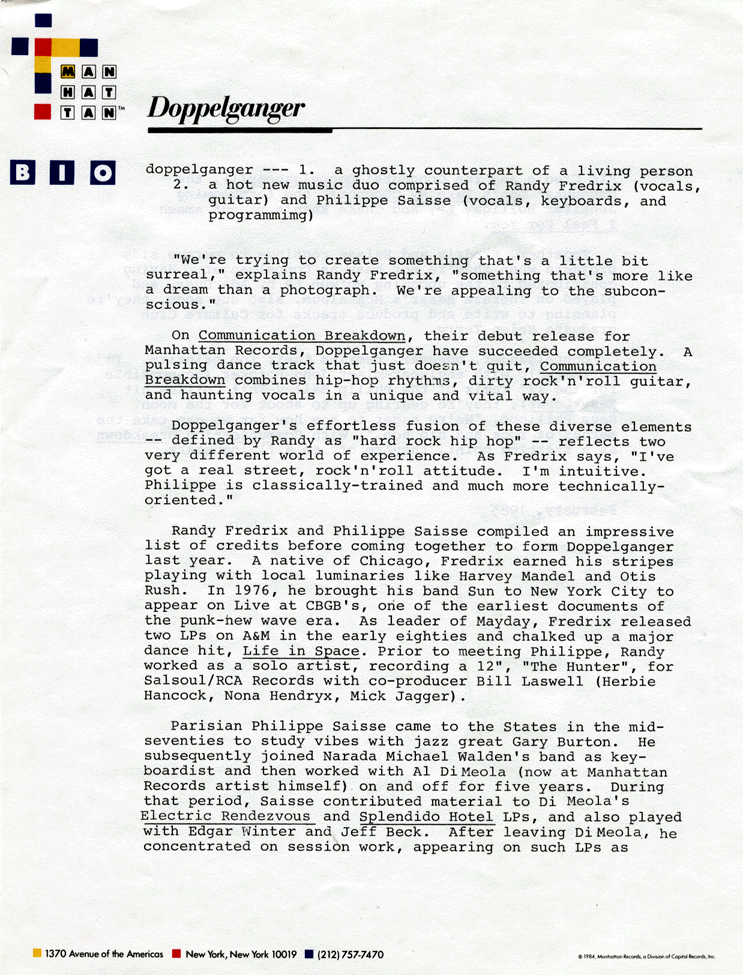 MP3 links open in new window. Close the new window to get back here. Side A: Side B: I purchased this EP as a cut-out from a used-record store in Kenmore Square in the mid 1980s. The following letter was included in the LP jacket and gives some background information about the band. About Doppelganger: |
