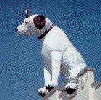 General Electric bought the RCA-Victor Company in the U.S. in the 1980's and sold the home entertainment division to Thomson Consumer Electronics in France. They elected to introduce a new trademark, showing Nipper and his young companion, Chipper. The company has to replace Chipper regularly with puppy-size look-alikes because puppies have a habit of growing.